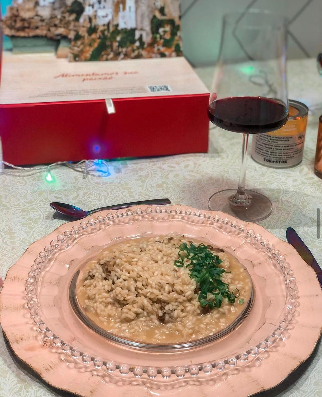 Hidrate por 30min o Funghi em 1 xícara de água quente e 1 colher de conhaque. Em seguida, passe o funghi em um coador de café, reserve o caldo e pique os cogumelos. Refogue o alho e cebola no azeite e manteiga. Em seguida, acrescente o arroz e refogue até ficar translúcido.